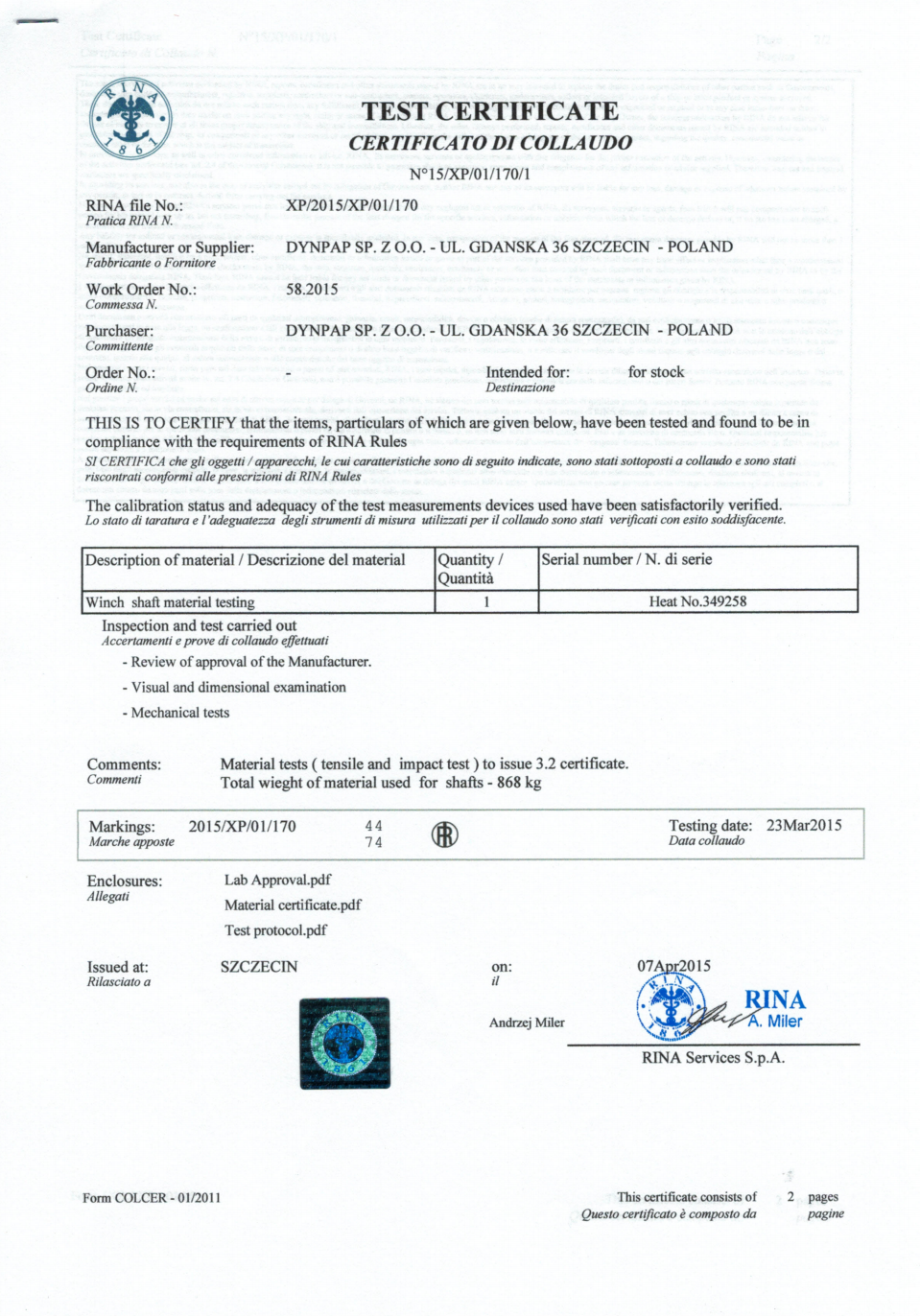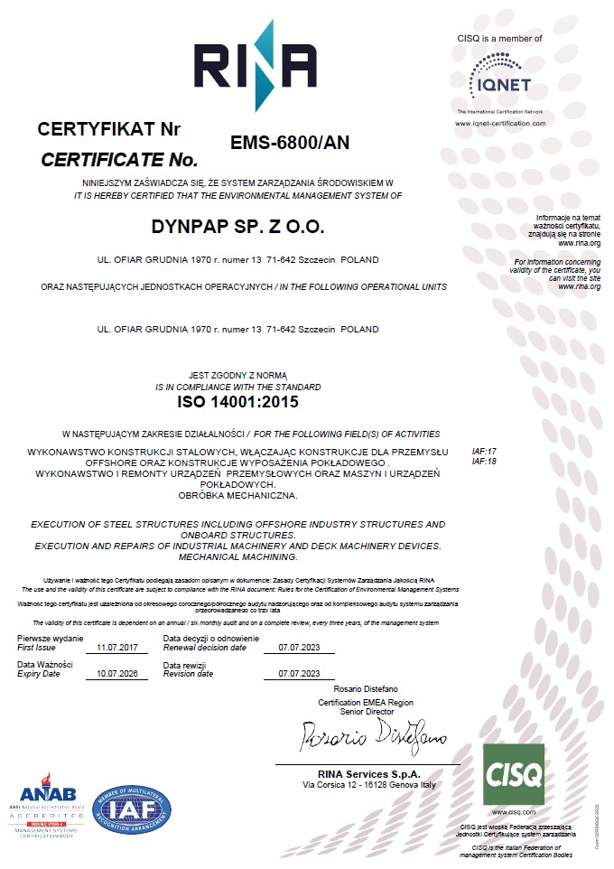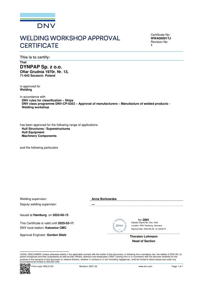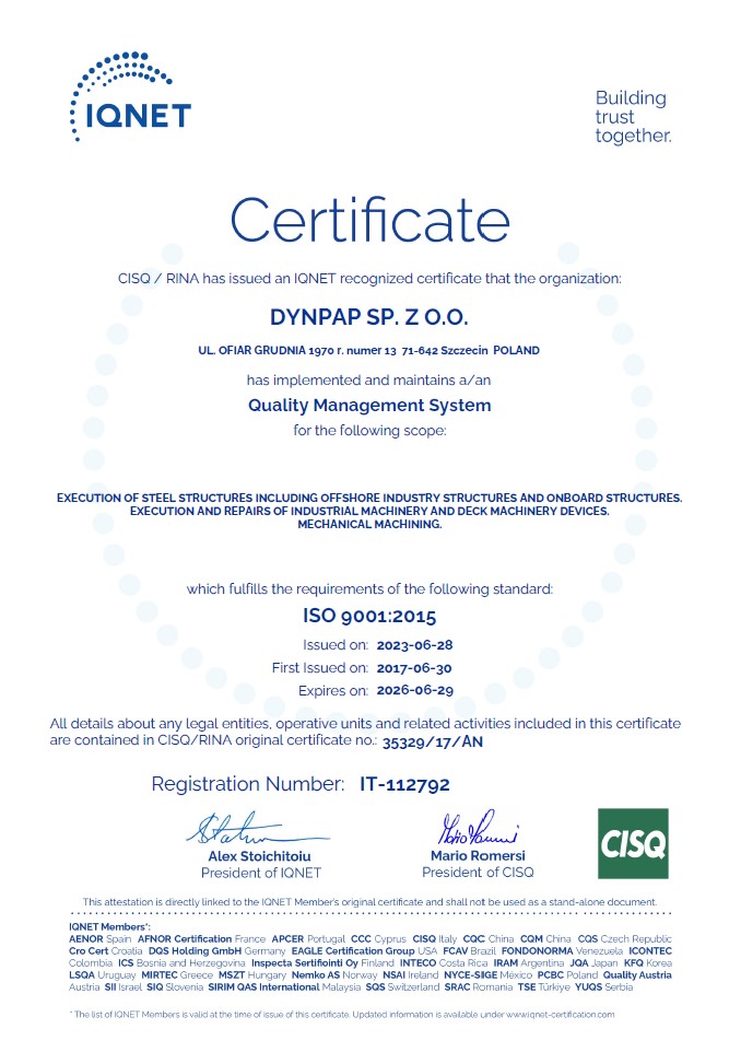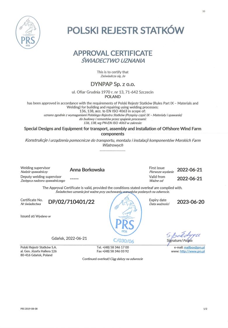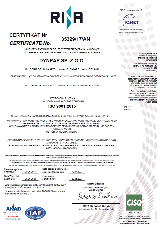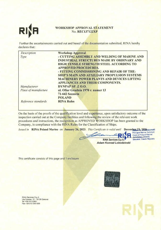 CERTYFIKATY RINA 9001 IQNET 9001 RINA 14001 IQNET 14001 RINA 45001 IQNET 45001 ISO 3834 RINA EN 1090-1 RINA RINA Welding Workshop RINA Approval Certificate – Overhauls and repairs RINA Approval of Mooring Winch RINA Approval of winch shaft material Certificate of firm conformity Prawo ochronne nr 260913 na znak towarowy PRS Approval Certificate Offshore Wind Farm Components PRS Approval Certificate Ship and Industrial Structures DNV Welding Workshop Approval Certificate