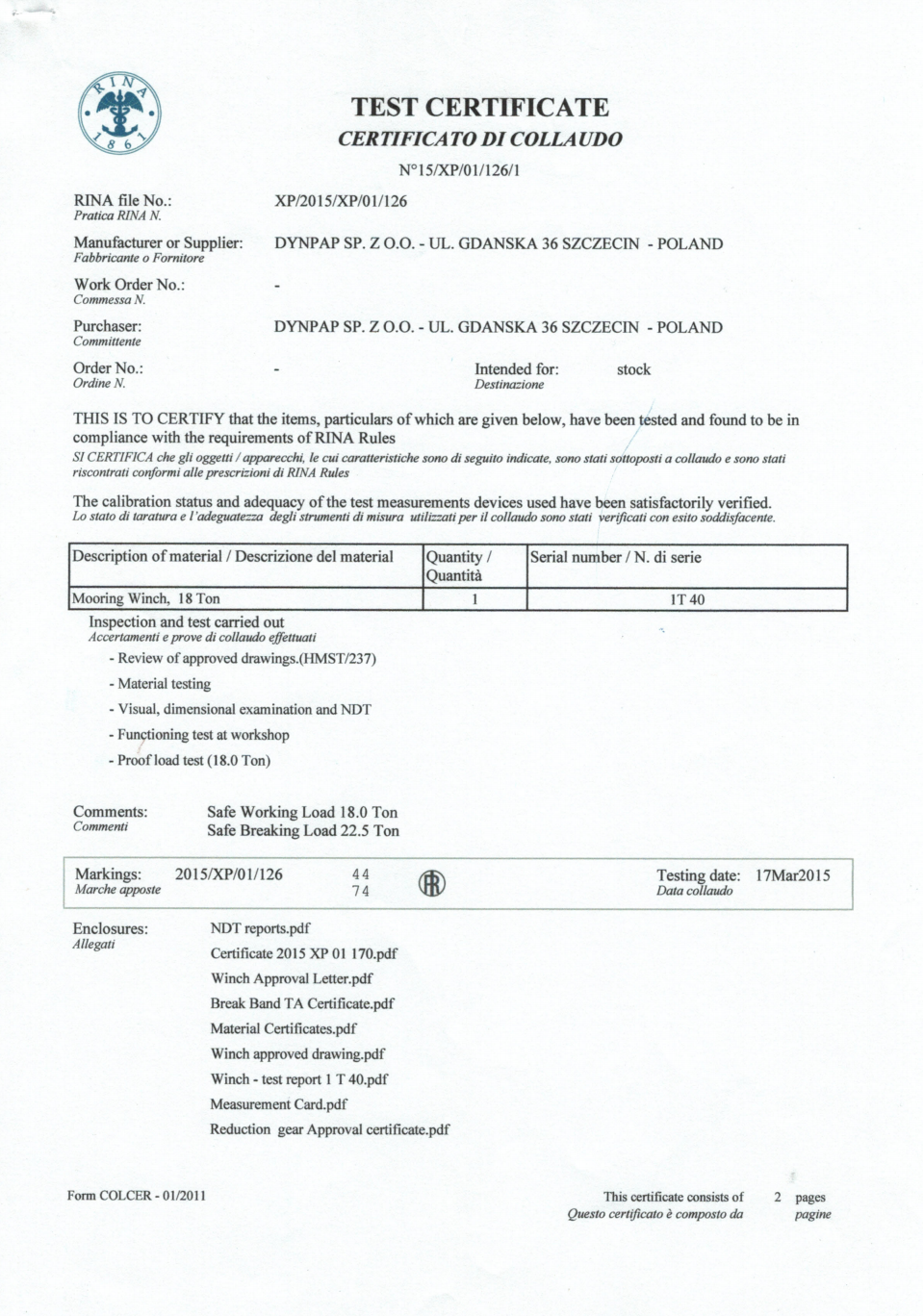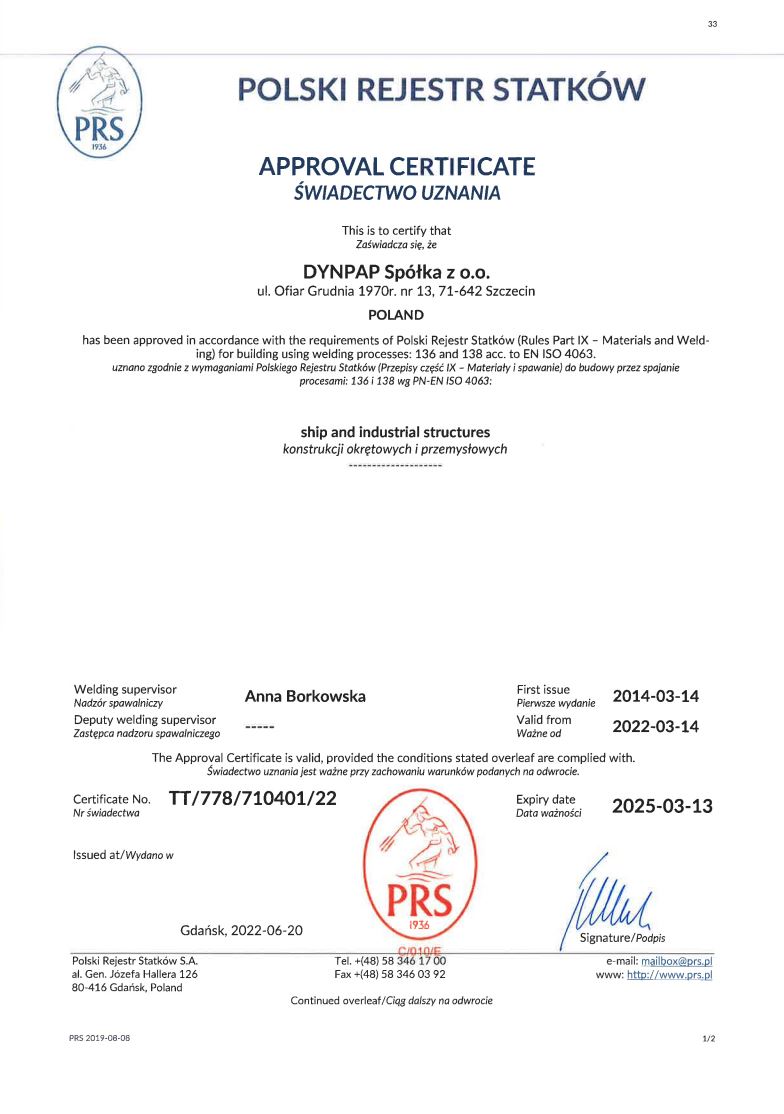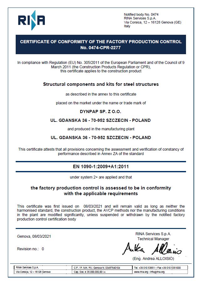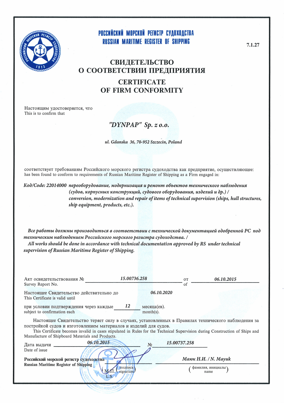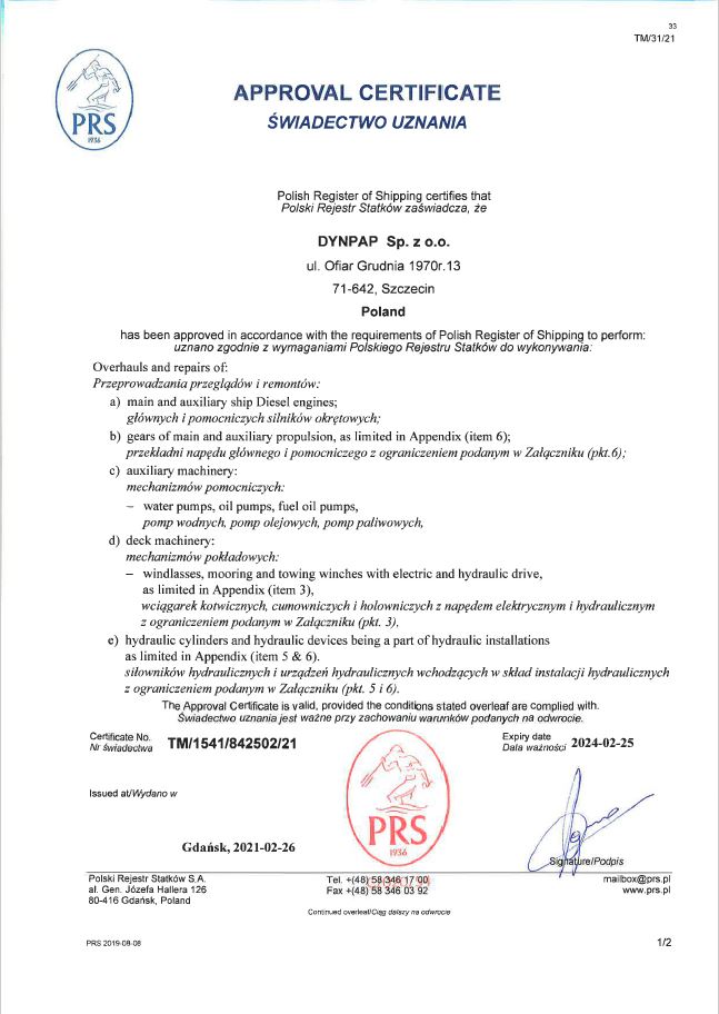 CERTYFIKATY RINA 9001 IQNET 9001 RINA 14001 IQNET 14001 RINA 45001 IQNET 45001 ISO 3834 RINA EN 1090-1 RINA RINA Welding Workshop RINA Approval Certificate – Overhauls and repairs RINA Approval of Mooring Winch RINA Approval of winch shaft material Certificate of firm conformity Prawo ochronne nr 260913 na znak towarowy PRS Approval Certificate Offshore Wind Farm Components PRS Approval Certificate Ship and Industrial Structures DNV Welding Workshop Approval Certificate